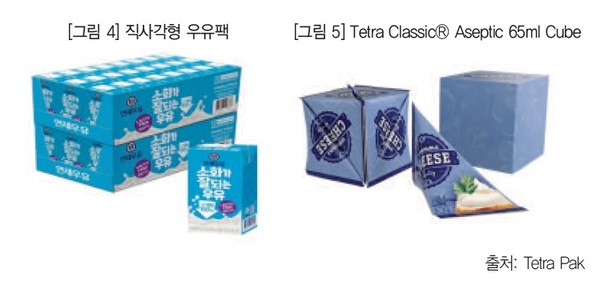 포장 전문 기업 테트라 팩(Tetra Pak)은 DFL 전략을 성공적으로 적용한 대표적인 사례이다. 이 회사는 유럽 표준 파렛트 규격(1,200×800mm)에 적재 효율을 고려하여 직사각형 우유팩을 설계하였다. 이러한 설계는 포장재의 낭비를 줄이고 물류비를 15% 절감하였다. 또한, ‘Tetra ClassicⓇ Aseptic 65ml Cube’이라는 제품은 여섯 개의 개별 포장이 하나의 정육면체를 형성하도록 설계되어 운송 및 보관 효율을 기존대비 40% 향상시켰다.(그림4, 5)